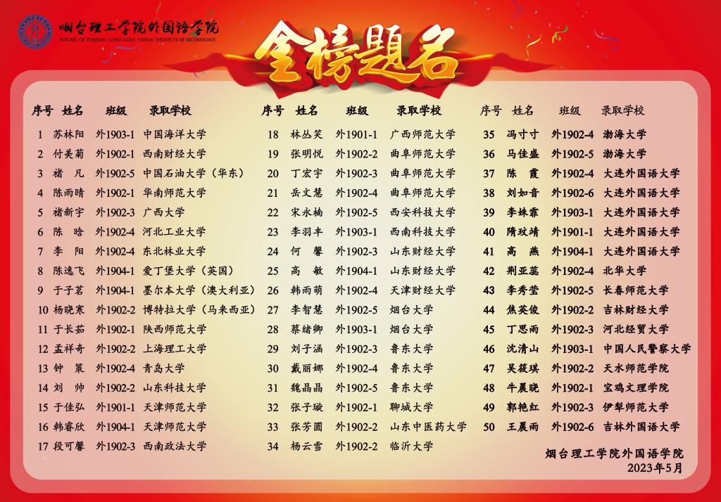 随着2023年全国硕士研究生招生录取工作落下帷幕,外国语学院捷报频传,考研录取创佳绩,今年外国语学院274名本科应届毕业生,192人报考,最终50人成功考取,录取率为18.25%,报考录取率为26.04%,报考率为70.07%。其中,7名同学考取国内双一流院校,占考研成功人数的14%,3名同学考取国外名校。