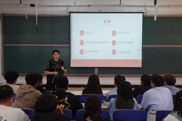 臧延云对学院专业及教师团队进行介绍,并针对中学与大学班级管理方式的差异性,从学习意识、纪律意识、团队意识、心理健康安全意识及文明礼仪等方面,对学生干部工作提出建议。